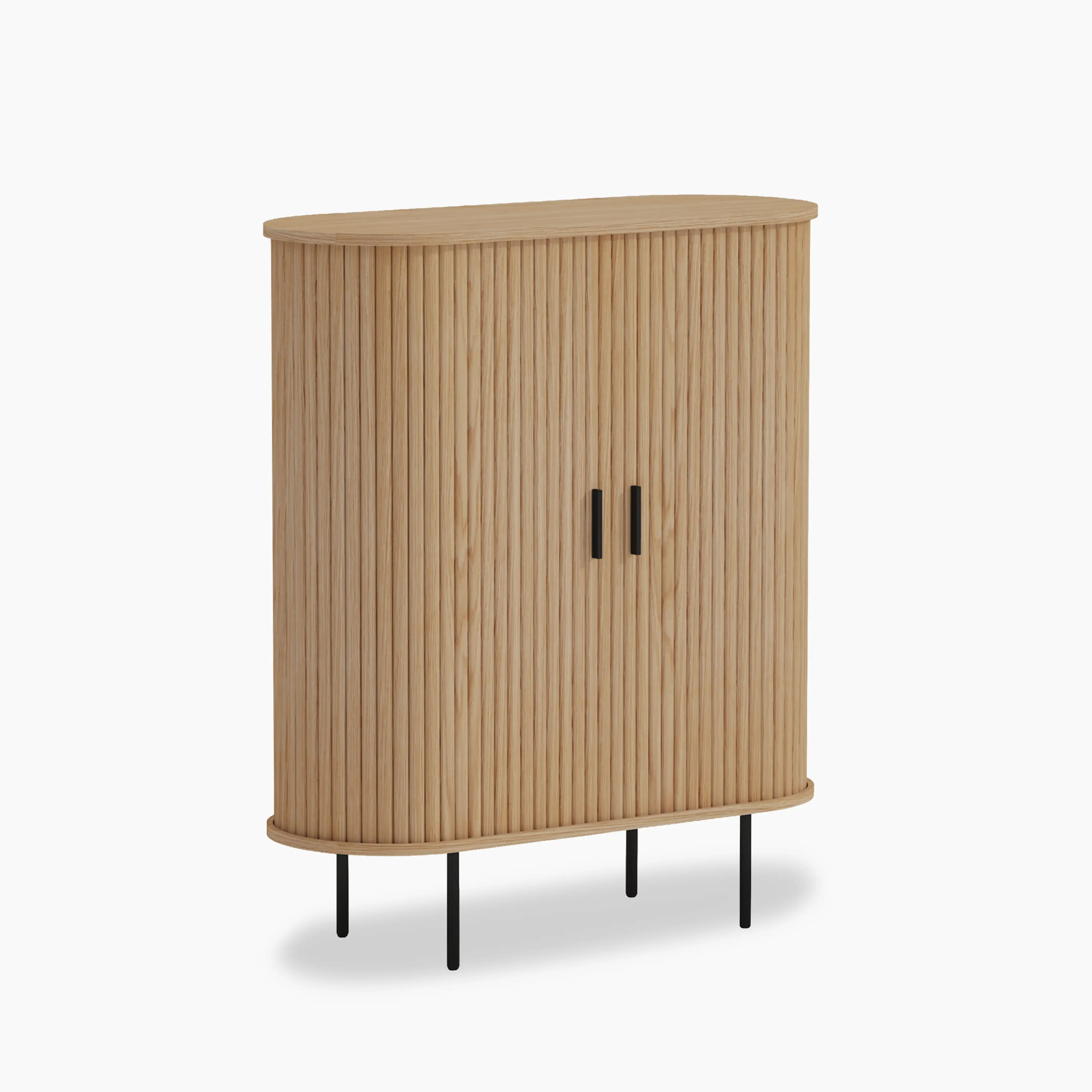 To declutter and organise in style, the concertina doors of the Mika Wooden Sideboard glide effortlessly across, revealing six spacious storage sections with fixed shelving, suitable for living rooms, dining rooms, and hallways. In an airy light finish with ribbed detailing, the Mika Tall Sideboard incorporates contemporary design with durable materials for a gorgeous storage option with practicality. Made from a specially treated oak veneer that is waterproof and stain resistant, the Mika Collection is easy to maintain and durable, for a long-lasting piece suitable for everyday use.