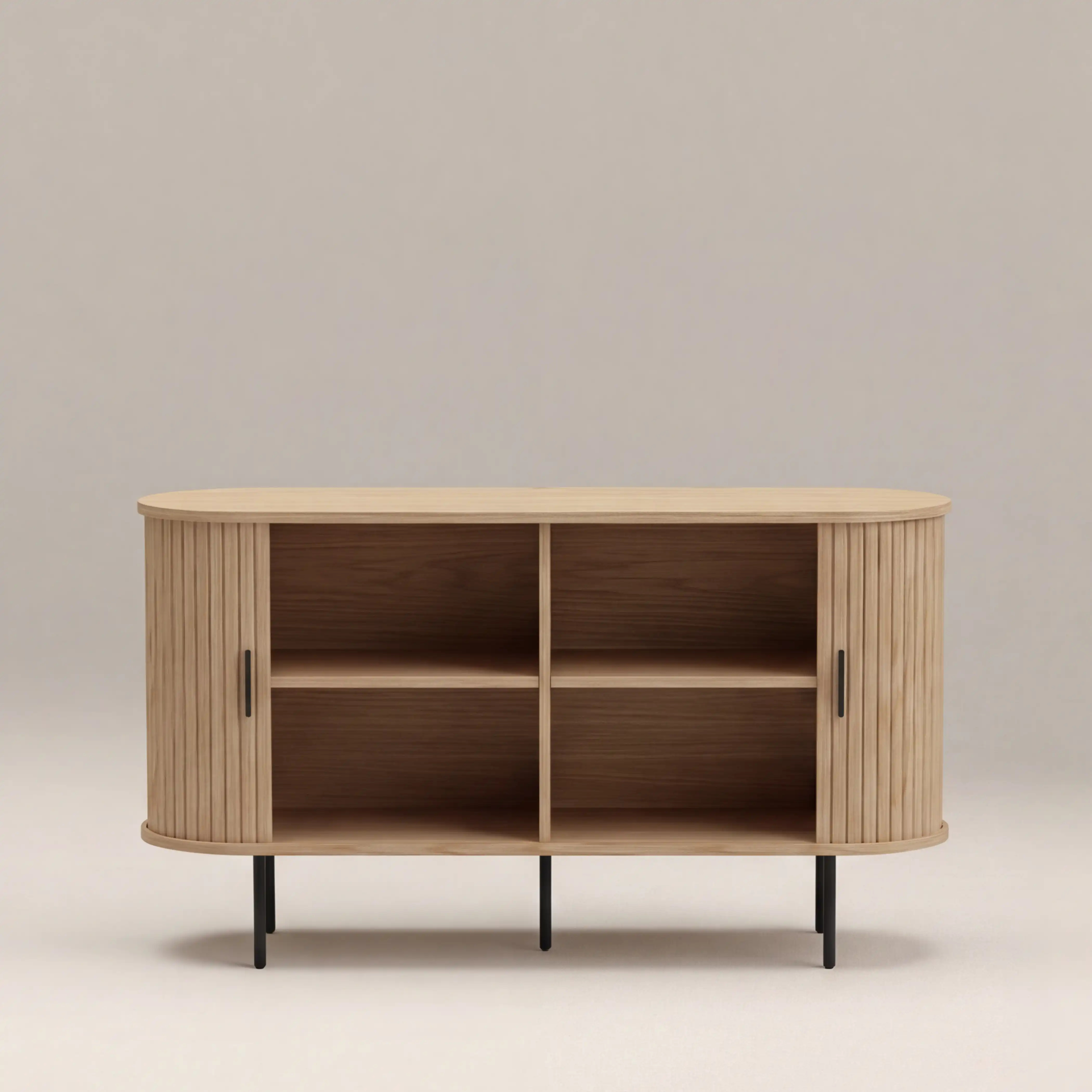 To declutter and organise in style, the concertina doors of the Mika Wooden Sideboard glide effortlessly across revealing four spacious storage sections with adjustable shelving for all manner of household items. In an airy light finish with ribbed detailing, the Mika Large Sideboard incorporates contemporary design with durable materials for a gorgeous storage option with practicality. Made from a specially treated oak veneer that is waterproof and stain resistant, the Mika Collection is easy to maintain and durable, for a long-lasting piece suitable for everyday use.