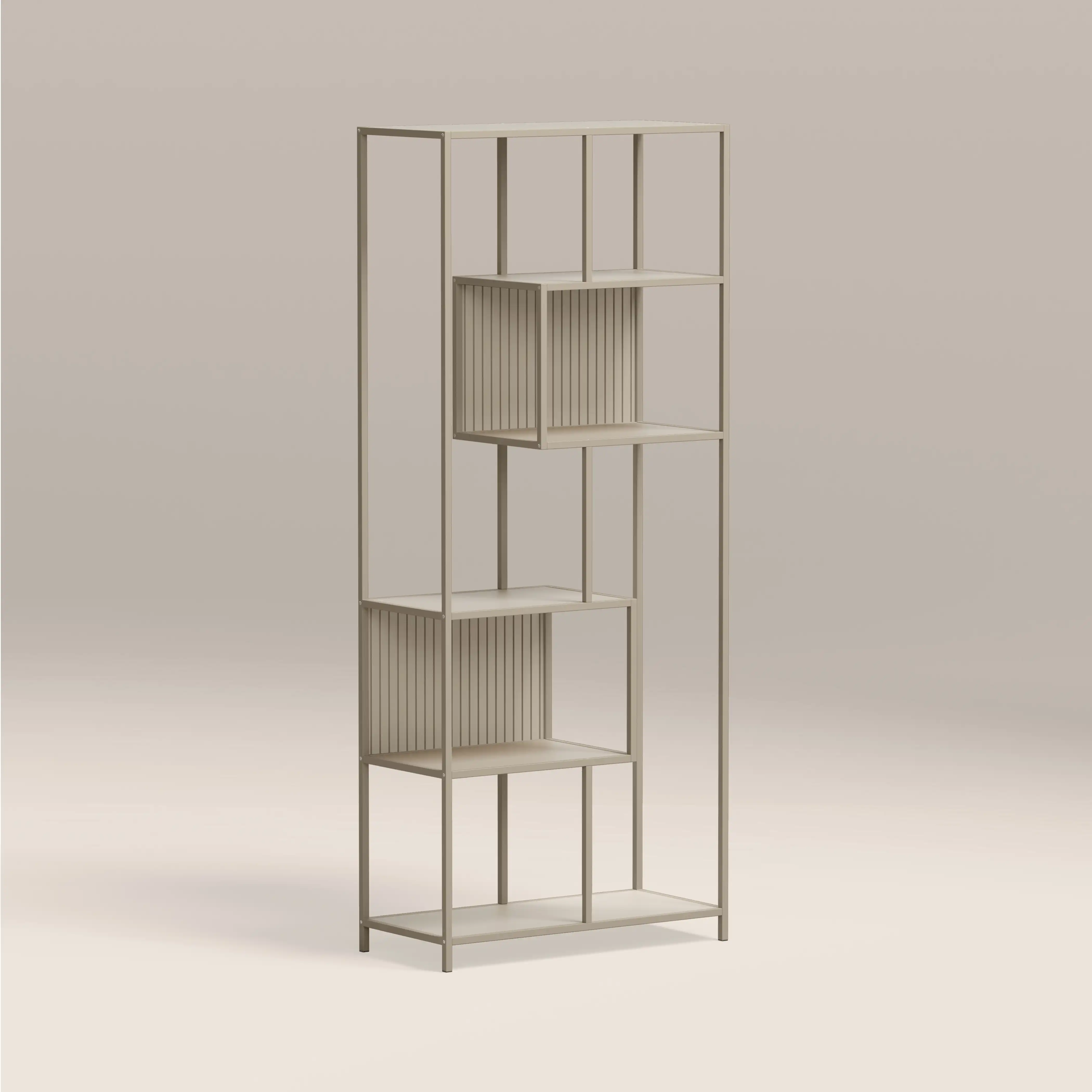 This Seaford Bookcase is designed to last. Its sleek metal frame has a taupe powder-coated finish with five shelves to provide ample space for storing essentials. This taupe bookcase is the perfect addition to your dining room or living area. This sleek design is the epitome of minimalist industrial design with ribbed backing to the alcove shelving for further visual depth.